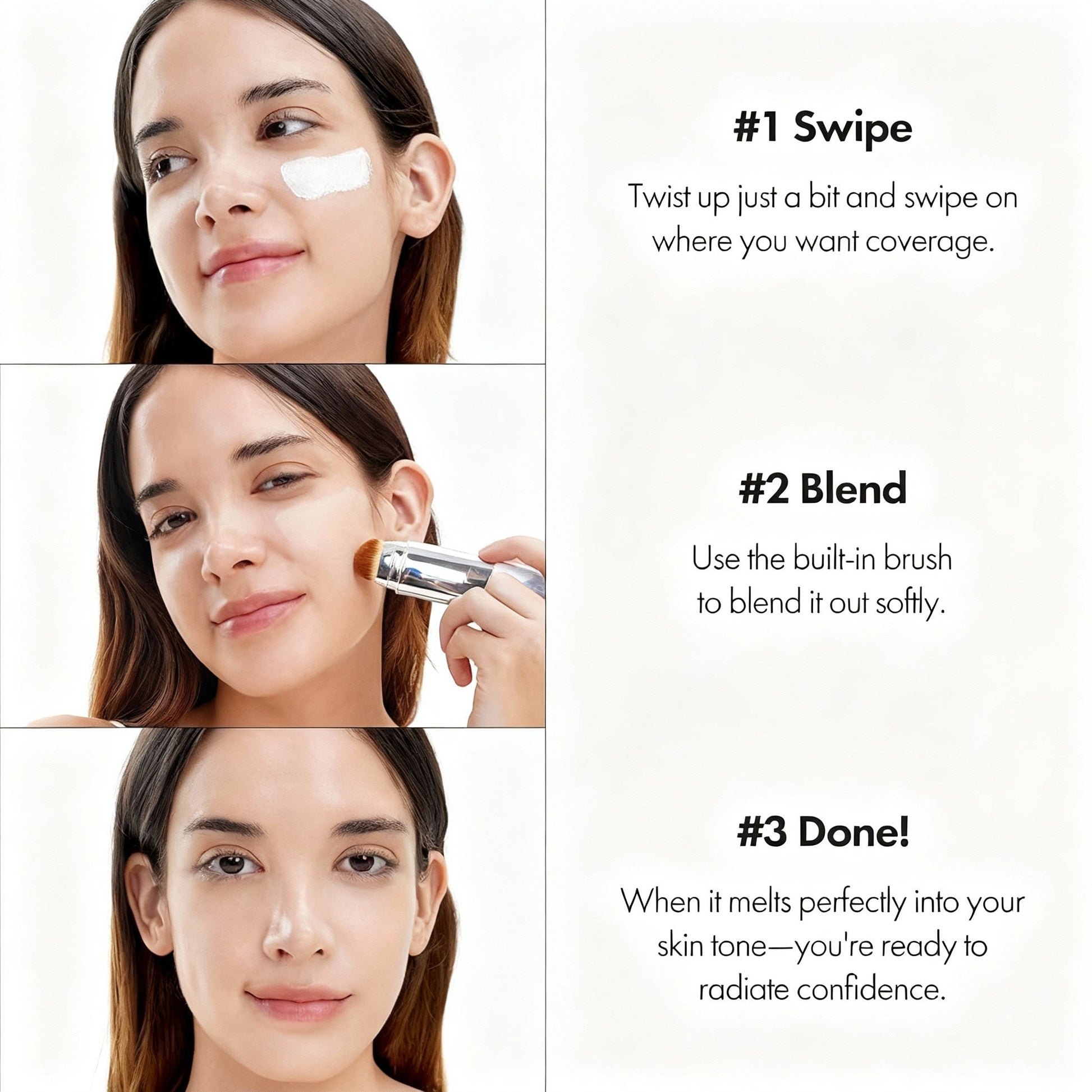 Forget the shade-match struggle! This innovative, dual-ended stick starts white and magically transforms on contact to become your perfect, custom color—every single time.